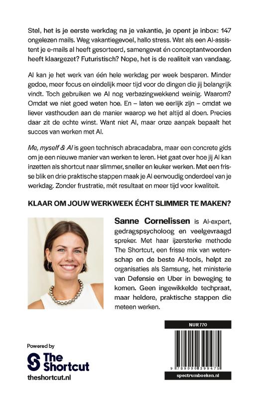 Klaar om jouw werkweek écht slimmer te maken? Stel, het is je eerste werkdag na je vakantie, je opent je inbox: 147 ongelezen mails. Weg vakantiegevoel, hallo stress. Wat als een AI-assistent je e-mails al heeft gesorteerd, samengevat én concept antwoorden heeft klaargezet? Futuristisch? Nope, het is de realiteit van vandaag. AI kan je het werk van één hele werkdag per week besparen. Minder gedoe, meer focus en eindelijk meer tijd voor de dingen die jij belangrijk vindt. Toch gebruiken we AI nog verbazingwekkend weinig. Waarom? Omdat we niet goed weten hoe. En – laten we eerlijk zijn – omdat we liever vasthouden aan de manier waarop we het altijd al doen. Precies daar zit de echte winst. Want niet AI, maar onze aanpak bepaalt het succes van werken met AI. Me, myself & AI is geen technisch abracadabra, maar een concrete gids om je een nieuwe manier van werken te leren. Het gaat over hoe jij AI kan inzetten als shortcut naar slimmer, sneller en leuker werken. Met een frisse blik en drie praktische stappen maak je AI eenvoudig onderdeel van je werkdag. Zonder frustratie, mét resultaat en meer tijd voor kwaliteit. Sanne Cornelissen is AI-expert, gedragspsycholoog en veelgevraagd spreker. Met haar ijzersterke methode The Shortcut, een frisse mix van wetenschap en de beste AI-tools, helpt ze organisaties als Samsung, het ministerie van Defensie en Uber in beweging te komen. Geen ingewikkelde techpraat, maar heldere, praktische stappen die meteen werken. ‘Sannes workshop gaf een helder inzicht van hoe ons brein werkt en hoe we die kennis kunnen gebruiken om slimme AI-routines te creëren. Samen met de AI-tools kon het team de volgende dag meteen de eerste stappen zetten.’ Charlotte Schoots, Ace & Tate ‘Absoluut de enige die door haar enthousiaste presentatiestijl en actionable tips een masterclass heeft weten te maken waar ik moeiteloos mijn aandacht bij kon houden.’ Ron Simpson, creatief ondernemer