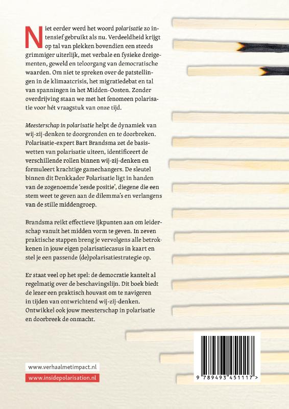 Niet eerder werd het woord polarisatie zo intensief gebruikt als nu. Verdeeldheid krijgt op tal van plekken bovendien een steeds grimmiger uiterlijk, met verbale en fysieke dreigementen, geweld en teloorgang van democratische waarden. Om niet te spreken over de patstellingen in de klimaatcrisis, het migratiedebat en tal van spanningen in het Midden-Oosten. Zonder overdrijving staan we met het fenomeen polarisatie voor hét vraagstuk van onze tijd. Meesterschap in polarisatie helpt de dynamiek van wij-zij-denken te doorgronden en te doorbreken. Polarisatie-expert Bart Brandsma zet de basiswetten van polarisatie uiteen, identificeert de verschillende rollen binnen wij-zij-denken en formuleert krachtige gamechangers. De sleutel binnen dit Denkkader Polarisatie ligt in handen van de zogenoemde ‘zesde positie’, diegene die een stem weet te geven aan de dilemma’s en verlangens van de stille middengroep. Brandsma reikt effectieve ijkpunten aan om leiderschap vanuit het midden vorm te geven. In zeven praktische stappen breng je vervolgens alle betrokkenen in jouw eigen polarisatiecasus in kaart en stel je een passende (de)polarisatiestrategie op. Er staat veel op het spel: de democratie kantelt al regelmatig over de beschavingslijn. Dit boek biedt de lezer een praktisch houvast om te navigeren in tijden van ontwrichtend wij-zij-denken. Ontwikkel ook jouw meesterschap in polarisatie en doorbreek de onmacht.