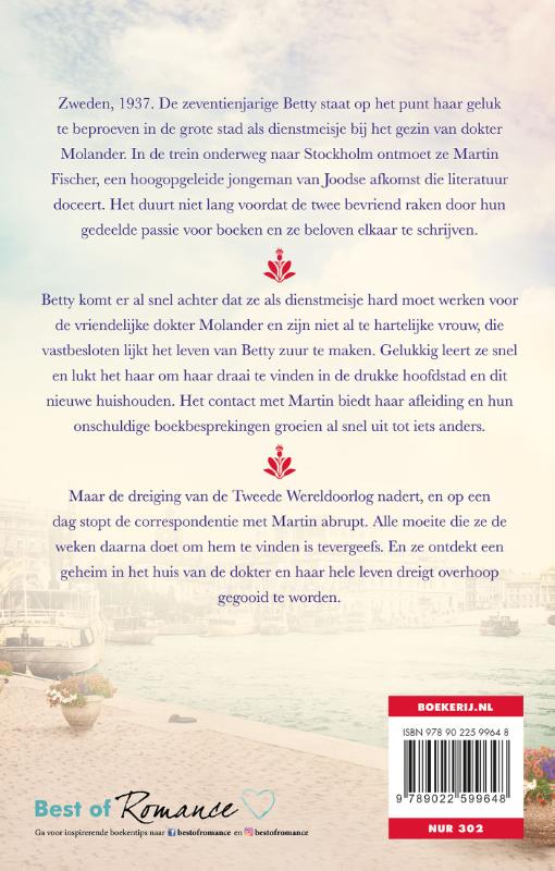 ‘Deel 1 van een nieuwe, meeslepende serie die ook de fans van Corina Bomann zal aanspreken.’ TrosKompas ' Een indrukwekkende debuutroman.' ***** Ingrid Loeff 'Een verhaal waarin ik vrijwel direct verdween.' ***** Bibi 'Goed begin van deze serie!  Het is een vlotte roman die gemakkelijk leest en gaandeweg het verhaal alleen maar beter wordt.' **** Ingrid Lemmens 'Geweldige Scandinavische historische roman!' ***** Louise 'Het boek heeft een prachtig open einde, waardoor je het met een zucht dichtslaat en je direct afvraagt wanneer het volgende deel van de serie “Het Zweedse lot “uit zal komen.Een echte aanrader om te lezen dus! ***** Jolanda Zweden, 1937. De zeventienjarige Betty staat op het punt haar gelukte beproeven in de grote stad als dienstmeisje bij het gezin van dokter Molander. In de trein onderweg naar Stockholm ontmoet ze Martin Fischer, een hoogopgeleide jongeman van Joodse afkomst die literatuur doceert. Het duurt niet lang voordat de twee bevriend raken door hun gedeelde passie voor boeken en ze beloven elkaar te schrijven. Betty komt er al snel achter dat ze als dienstmeisje hard moet werken voor de vriendelijke dokter Molander en zijn niet al te hartelijke vrouw, die vastbesloten lijkt het leven van Betty zuur te maken. Gelukkig leert ze snel en lukt het haar om haar draai te vinden in de drukke hoofdstad en dit nieuwe huishouden. Het contact met Martin biedt haar afleiding en hun onschuldige boekbesprekingen groeien al snel uit tot iets anders. Maar de dreiging van de Tweede Wereldoorlog nadert, en op een dag stopt de correspondentie met Martin abrupt. Alle moeite die ze de weken daarna doet om hem te vinden is tevergeefs. En ze ontdekt een geheim in het huis van de dokter en haar hele leven dreigt overhoop gegooid te worden. In de pers 'De personages zijn mooi uitgewerkt en kruipen snel onder je huid. Af en toe wordt de lezer verrast door onverwachte plotwendingen die het verhaal voortdrijven richting het einde van het boek. Dat einde is een grote, open vraag en dit eerste deel van de trilogie smaakt dan ook absoluut naar meer.' **** Hebban.nl ‘Een werkelijk prachtig verteld verhaal dat levensecht aanvoelt en boeit vanaf de eerste pagina.’ Expressen ‘Katarina Widholms schrijfstijl dringt regelrecht door tot in mijn hart. Een perfect debuut.’ LitteraturMagazinet ‘Katarina Widholm verdient veel lof voor de manier waarop ze Betty’s dagelijks leven uitwerkt en de zorg waarmee ze de omgangsvormen uit de jaren dertig beschrijft.’ BorÃ¥s Tidning ‘Het verhaal neemt verrassende wendingen en is heerlijk gelaagd. ’ M-magasin ‘Katarina Widholm heeft zich met hart en ziel aan dit verhaal over jonge vrouwen in de jaren dertig gewijd. Een waarheidsgetrouwe weergave van de geschiedenis en een hartverwarmend verhaal.’ Ölandsbladet ‘Indrukwekkende debuutroman. Het alledaagse leven wordt zo spannend verteld dat je van schrik opveert als er een deur op het verkeerde moment opengaat.’ Dagens Nyheter