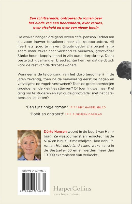 Een schitterende, ontroerende roman over het einde van een boerendorp, over verlies, over afscheid en over een nieuw begin. De wolken hangen dreigend boven café-pension Feddersen als zoon Ingwer terugkeert naar zijn geboortedorp. Hij heeft iets goed te maken. Grootmoeder Ella begint langzaam maar zeker haar verstand te verliezen, grootvader Sönke houdt koppig stand in zijn oude dorpskroeg. Diens beste tijd ligt al lang en breed achter hem, en dat geldt ook voor de rest van de dorpsbewoners. Wanneer is de teloorgang van het dorp begonnen? In de jaren zeventig, toen na de verkaveling eerst de hagen en vervolgens de vogels verdwenen? Toen de grote boerderijen groeiden en de kleintjes stierven? Of toen Ingwer naar Kiel ging om te studeren en zijn oude grootvader met het café-pension liet zitten? ‘Opnieuw een prachtige roman over een landschap met littekens.’ AD **** ‘Een waardig vervolg op haar debuut, waarin ze de Brinkebüllse gemeenschap een gelaagde stem geeft, en opnieuw een waardig beeld neerzet van een dorp dat weerstand biedt aan de vaart van alledag.’ NRC Handelsblad ***** ‘Een Europees narratief, prachtig beschreven.’ Der Spiegel ‘Zo indringend worden boeken zelden.’ Allgemeine