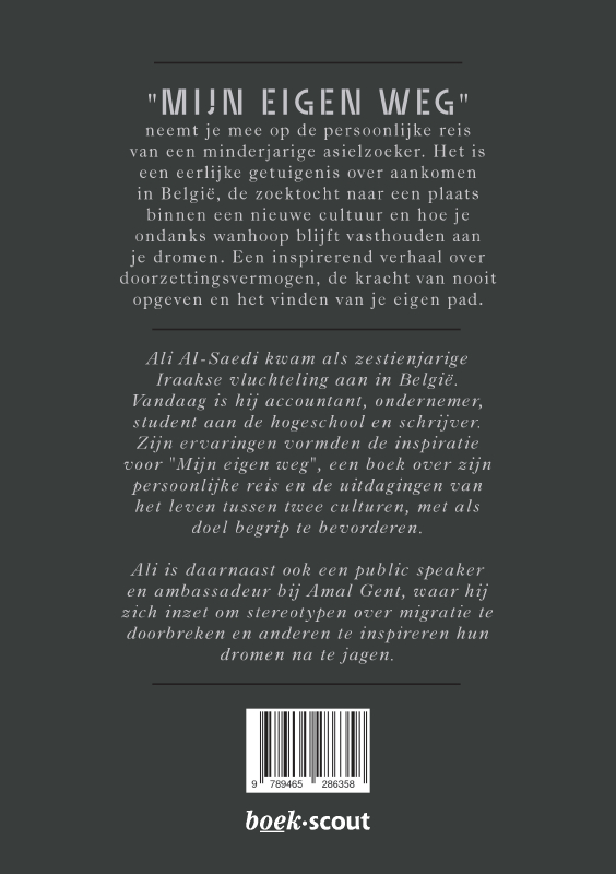 "Mijn eigen weg" neemt je mee op de persoonlijke reis van een minderjarige asielzoeker. Het is een eerlijke getuigenis over aankomen in België, de zoektocht naar een plaats binnen een nieuwe cultuur en hoe je ondanks wanhoop blijft vasthouden aan je dromen. Een inspirerend verhaal over doorzettingsvermogen, de kracht van nooit opgeven en het vinden van je eigen pad.