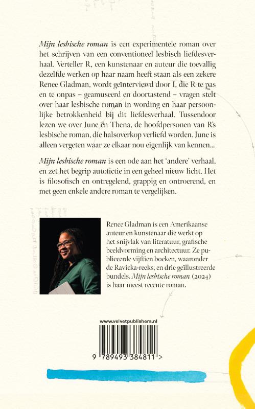Mijn lesbische roman is een experimentele roman over het schrijven van een conventioneel lesbisch liefdesverhaal. Verteller R, een kunstenaar en auteur die toevallig dezelfde werken op haar naam heeft staan als een zekere Renee Gladman, wordt geïnterviewd door I, die R te pas en te onpas – geamuseerd en doortastend – vragen stelt over haar lesbische roman in wording en haar persoonlijke betrokkenheid bij dit liefdesverhaal. Tussendoor lezen we over June en Thena, de hoofdpersonen van R’s lesbische roman, die halsoverkop verliefd worden. June is alleen vergeten waar ze elkaar nou eigenlijk van kennen… Mijn lesbische roman is een ode aan het ‘andere’ verhaal, en zet het begrip autofictie in een geheel nieuw licht. Het is filosofisch en ontregelend, grappig en ontroerend, en met geen enkele andere roman te vergelijken.