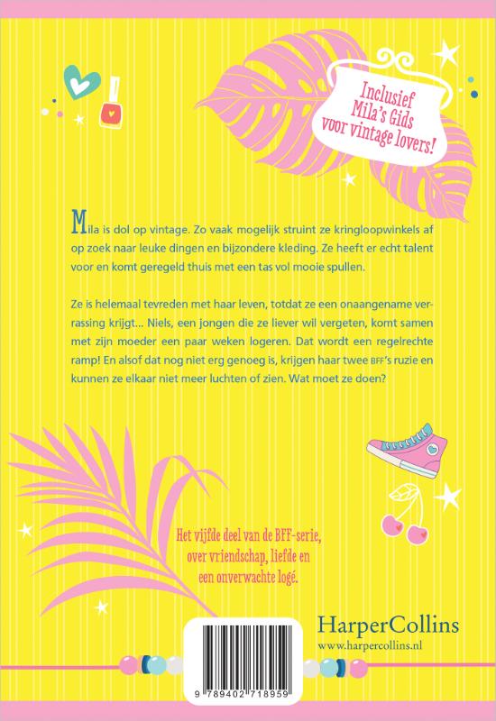 Mila, vintage lover van Jette Schröder is het vijfde deel van de vrolijke meidenserie BFF, vol humor, vriendschap en liefde. Mila is dol op vintage. Zo vaak mogelijk struint ze kringloopwinkels af op zoek naar leuke dingen en bijzondere kleding. Ze heeft er echt talent voor en komt geregeld thuis met een tas vol mooie spullen. Ze is helemaal tevreden met haar leven, totdat ze een onaangename verrassing krijgt... Niels, een jongen die ze liever wil vergeten, komt samen met zijn moeder een paar weken logeren. Dat wordt een regelrechte ramp! En alsof dat nog niet erg genoeg is, krijgen haar twee BFF’s ruzie en kunnen ze elkaar niet meer luchten of zien. Wat moet ze doen? ‘Net alsof je over je eigen vriendinnen leest.’ Hebban *****