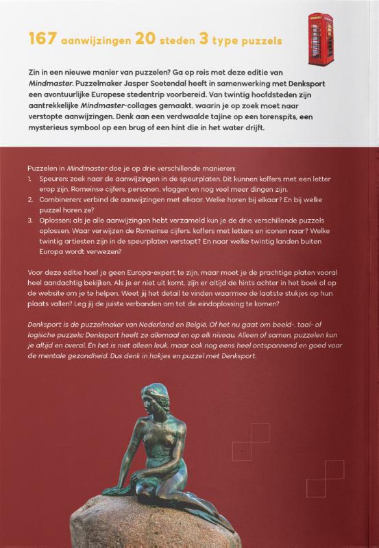 167 aanwijzingen 20 steden 3 puzzels Zin in een nieuwe manier van puzzelen? Ga op reis met deze editie van Mindmaster. Puzzelmaker Jasper Soetendal heeft in samenwerking met Denksport een avontuurlijke Europese stedentrip voorbereid. Van twintig hoofdsteden zijn aantrekkelijke Mindmaster-collages gemaakt, waarin je op zoek moet naar verstopte aanwijzingen. Denk aan een verdwaalde tajine op een torenspits, een mysterieus symbool op een brug of een hint die in het water drijft. Puzzelen in Mindmaster doe je op drie verschillende manieren: 1. Speuren: zoek naar de aanwijzingen in de speurplaten. Dit kunnen koffers met een letter erop zijn, Romeinse cijfers, personen, vlaggen en nog veel meer dingen zijn. 2. Combineren: verbind de aanwijzingen met elkaar. Welke horen bij elkaar? En bij welke puzzel horen ze? 3. Oplossen: als je alle aanwijzingen hebt verzameld kun je de drie verschillende puzzels oplossen. Waar verwijzen de Romeinse cijfers, koffers met letters en iconen naar? Welke twintig artiesten zijn in de speurplaten verstopt? En naar welke twintig landen buiten Europa wordt verwezen? Voor deze editie hoef je geen Europa-expert te zijn, maar moet je de prachtige platen vooral heel aandachtig bekijken. Als je er niet uit komt, zijn er altijd de hints achter in het boek of op de website om je te helpen. Weet jij het detail te vinden waarmee de laatste stukjes op hun plaats vallen? Leg jij de juiste verbanden om tot de eindoplossing te komen? Denksport is dé puzzelmaker van Nederland en België. Of het nu gaat om beeld-, taal- of logische puzzels: Denksport heeft ze allemaal en op elk niveau. Alleen of samen, puzzelen kun je altijd en overal. En het is niet alleen leuk, maar ook nog eens heel ontspannend en goed voor de mentale gezondheid. Dus denk in hokjes en puzzel met Denksport.
