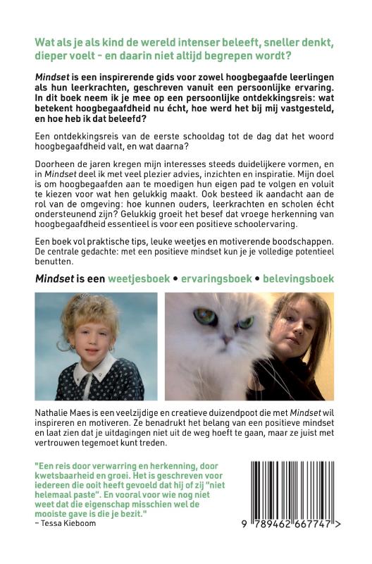 Wat als je als kind de wereld intenser beleeft, sneller denkt, dieper voelt – en daarin niet altijd begrepen wordt? Mindset is een inspirerende gids voor zowel hoogbegaafde leerlingen als hun leerkrachten, geschreven vanuit een persoonlijke ervaring. In dit boek neem ik je mee op een persoonlijke ontdekkingsreis: Wat betekent hoogbegaafdheid nu écht, hoe werd het bij mij vastgesteld, en hoe heb ik dat beleefd? Een ontdekkingsreis van de eerste schooldag tot de dag dat het woord hoogbegaafdheid valt, en wat daarna? Doorheen de jaren kregen mijn interesses steeds duidelijkere vormen, en in Mindset deel ik met veel plezier advies, inzichten en inspiratie. Mijn doel is om hoogbegaafden aan te moedigen hun eigen pad te volgen en voluit te kiezen voor wat hen gelukkig maakt. Ook besteed ik aandacht aan de rol van de omgeving: hoe kunnen ouders, leerkrachten en scholen écht ondersteunend zijn? Gelukkig groeit het besef dat vroege herkenning van hoogbegaafdheid essentieel is voor een positieve schoolervaring. Een boek vol praktische tips, leuke weetjes en motiverende boodschappen. De centrale gedachte: met een positieve mindset kun je je volledige potentieel benutten. Mindset is een weetjesboek, ervaringsboek en belevingsboek. Nathalie Maes is een veelzijdige en creatieve duizendpoot die met Mindset wil inspireren en motiveren. Ze benadrukt het belang van een positieve mindset en laat zien dat je uitdagingen niet uit de weg hoeft te gaan, maar ze juist met vertrouwen tegemoet kunt treden.