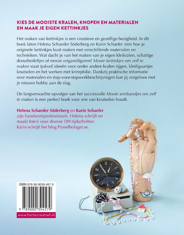 Zelf sieraden maken is leuk en makkelijk! In dit boek delen twee handwerkprofessionals hun beste ideeën en slimste tips voor mooie kettinkjes om zelf te maken. Het boek bevat veel projecten met verschillende technieken en materialen. Wat dacht je van het maken van je eigen kleikralen, schattige donut-bedeltjes of mooie origamifiguren? Mooie kettinkjes om zelf te maken staat tjokvol ideeën voor kralen rijgen, kleifiguurtjes knutselen, knopenkralen en het werken met krimpfolie. Door de vele foto’s en stap-voor-stapbeschrijvingen is het boek geschiikt voor jong en oud.