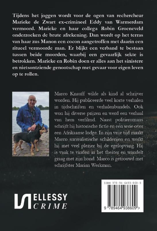 Tijdens het joggen wordt voor de ogen van rechercheur Marieke de Zwart ex-crimineel Eddy van Warmerdam vermoord. Marieke en haar collega Robin Groeneveld onderzoeken de brute afrekening. Dan wordt op het terras van haar zus Manon een cocon aangetroffen met daarin een ritueel vermoorde man. Er blijkt een verband tussen beide moorden te bestaan waarbij een gevaarlijk sekte is betrokken. Marieke en Robin doen er alles aan het sinistere en nietsontziende genootschap met gevaar voor eigen leven op te rollen. Marco Knauff wilde als kind al schrijver worden. Hij publiceerde veel korte verhalen in tijdschriften en verhalenbundels. Ook won hij diverse prijzen en werd een verhaal van hem verfilmd. Naast politieromans schrijft hij historische fictie en een serie over een Afrikaanse lodge. In zijn vrije tijd maakt Marco surrealistische schilderijen en werkt hij met veel plezier bij de egelopvang. Hij is vaak te vinden in het theater en wandelt graag met zijn hond. Marco is getrouwd met schrijfster Marian Werkman.