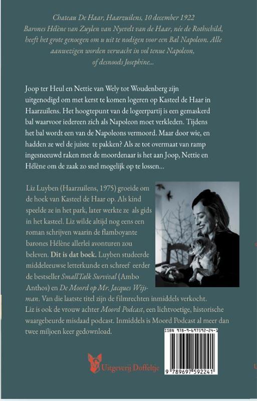 Chateau De Haar, Haarzuilens, 10 december 1922 Barones Hélène van Zuylen van Nyevelt van de Haar, née de Rothschild, heeft het grote genoegen om u uit te nodigen voor een Bal Napoleon. Alle aanwezigen worden verwacht in vol tenue Napoleon, of desnoods Josephine... Joop ter Heul en Nettie van Wely tot Woudenberg zijn uitgenodigd om met kerst te komen logeren op Kasteel de Haar in Haarzuilens. Het hoogtepunt van de logeerpartij is een gemaskerd bal waarvoor iedereen zich als Napoleon moet verkleden. Tijdens het bal wordt een van de Napoleons vermoord. Maar door wie, en hadden ze wel de juiste te pakken? Als ze tot overmaat van ramp ingesneeuwd raken met de moordenaar is het aan Joop, Nettie en Hélène om de zaak zo snel mogelijk op te lossen… Liz Luyben (Haarzuilens, 1975) groeide om de hoek van Kasteel de Haar op. Als kind speelde ze in het park, later werkte ze als gids in het kasteel. Liz wilde altijd nog eens een roman schrijven waarin de flamboyante barones Hélène allerlei avonturen zou beleven. Dit is dat boek. Luyben studeerde middeleeuwse letterkunde en schreef eerder de bestseller SmallTalk Survival (Ambo Anthos) en De Moord op Mr. Jacques Wijsman man. Van die laatste titel zijn de filmrechten inmiddels verkocht. Liz is ook de vrouw achter Moord Podcast, een lichtvoetige, historische waargebeurde misdaad podcast. Inmiddels is Moord Podcast al meer dan twee miljoen keer gedownload.