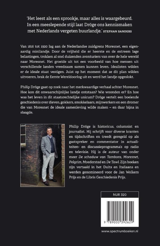 Het bijzondere verhaal van Nederlands vergeten buurland Moresnet ‘Historische schakelvertelkunst van het hoogste niveau.’ ••••• NRC Van 1816 tot 1920 lag aan de Nederlandse zuidgrens Moresnet, een eigenaardig minilandje. Door de vrijheid die er heerste en de extreem lage belastingen, trokken al snel duizenden avonturiers van over de hele wereld naar Moresnet. Het groeide uit tot een voorbeeld van hoe mensen uit verschillende landen vreedzaam samen kunnen leven. Idealisten wilden er de ideale staat vestigen. Juist op het moment dat ze dit plan wilden uitvoeren, brak de Eerste Wereldoorlog uit en werd het landje opgeslokt. Philip Dröge gaat op zoek naar het merkwaardige verhaal achter Moresnet. Hoe kon dit onwaarschijnlijke landje ontstaan? Wie woonden er? En hoe was het leven in dit staatsrechtelijke unicum? Dröge vertelt een boeiende geschiedenis over dieven, gokkers, smokkelaars, mijnwerkers en een dromer die van Moresnet de ideale samenleving wilde maken – en daar bijna in slaagde. Philip Dröge is historicus, columnist en journalist. Hij schrijft voor diverse kranten en tijdschriften en treedt geregeld op als gastspreker en commentator in actualiteiten- en discussieprogramma’s op radio en televisie. Hij is de auteur van onder meer De schaduw van Tambora , Moresnet , Pelgrim , Moederstad en De Tawl . Zijn boeken zijn vertaald in het Duits en Italiaans en werden genomineerd voor de Jan Wolkers Prijs en de Libris Geschiedenis Prijs. De pers over  Moresnet : ‘Zoals in zijn eerdere boek  De schaduw van Tambora , bedrijft Dröge ook hier weer historische schakelvertelkunst van het hoogste niveau. Hij sleept op overtuigende wijze randgebeurtenissen naar het centrum van zijn belangstelling.’  ••••• NRC ‘Het leest als een sprookje, maar alles is waargebeurd. In een meeslepende stijl laat Dröge ons kennismaken met Nederlands vergeten buurlandje.’  Stephan Sanders