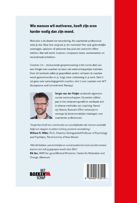 Wie mensen wil motiveren heeft zijn oren harder nodig dan zijn mond. Als coachend professional weet je dat motivatie de sleutel is tot verandering. Maar hoe kun je effectief de motivatie vergroten? Uit onderzoek blijkt dat veel dingen die we gewend zijn te doen, averechts werken. Overtuigen, oplossen, adviseren: ze maken de kans op verandering vaak kleiner. Wat wel werkt? Luisteren, compassie tonen, samenwerken en verandertaal ontlokken. Dit boek leert je hoe je dat doet. Dit is het eerste deel van een trilogie over coachen op basis van wetenschappelijke inzichten. Met Coachen 3.0 – Motiverende gespreksvoering in handen zullen je gesprekken totaal anders verlopen met als resultaat: meer motivatie bij je coachee en meer voldoening bij jou. Deel 2 zal gaan over Oplossingsgericht Coachen en deel 3 over Coachen met ACT. Sergio van der Pluijm studeerde Algemene Sociale Wetenschappen en werkte 15 jaar lang in het reclasseringsveld. Het bleek een mooie en rijke leerschool rondom termen als motivatie, weerstand, en gedragsverandering. Hij verdiepte zich in diverse coach-methoden en gelooft nu dat coachende professionals vaak veel effectiever kunnen werken met meer plezier en minder moeite. Eind 2009 richtte hij Bureau Bewezen Effect op en sindsdien ontwerpt en verzorgt hij breinvriendelijke trainingen voor coachende professionals in onderwijs, zorg en het publieke domein. ‘Sergio beschrijft Een combinatie van vaardigheden die mensen werkelijk helpt om stappen te zetten richting positieve verandering.’ William R. Miller, PhD., Emeritus Distinguished Professor of Psychology and Psychiatry, The University of New Mexico. ‘Met dit heldere, overzichtelijke en vooral praktische boek zou het zomaar kunnen dat ook jij gegrepen wordt door MGV.’ Rik Bes, Centre for Motivation and Change, Hilversum