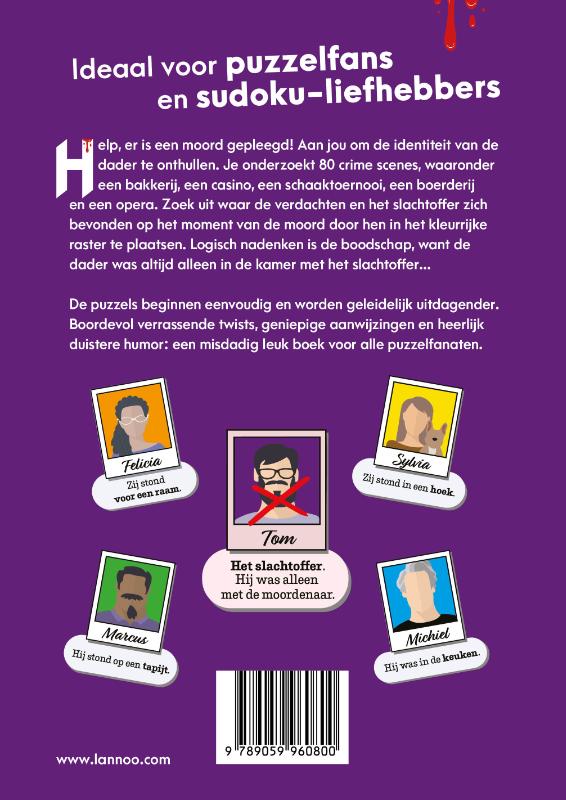Help, er is een moord gepleegd! Aan jou om de identiteit van de dader te onthullen. Je onderzoekt 80 crime scenes, waaronder een bakkerij, een casino, een schaaktoernooi, een boerderij en een opera. Zoek uit waar de verdachten en het slachtoffer zich bevonden op het moment van de moord door hen in het kleurrijke raster te plaatsen. Logisch nadenken is de boodschap, want de dader was altijd alleen in de kamer met het slachtoffer... De puzzels beginnen eenvoudig en worden geleidelijk uitdagender. Boordevol verrassende twists, geniepige aanwijzingen en heerlijk duistere humor: een misdadig leuk boek voor alle puzzelfanaten.