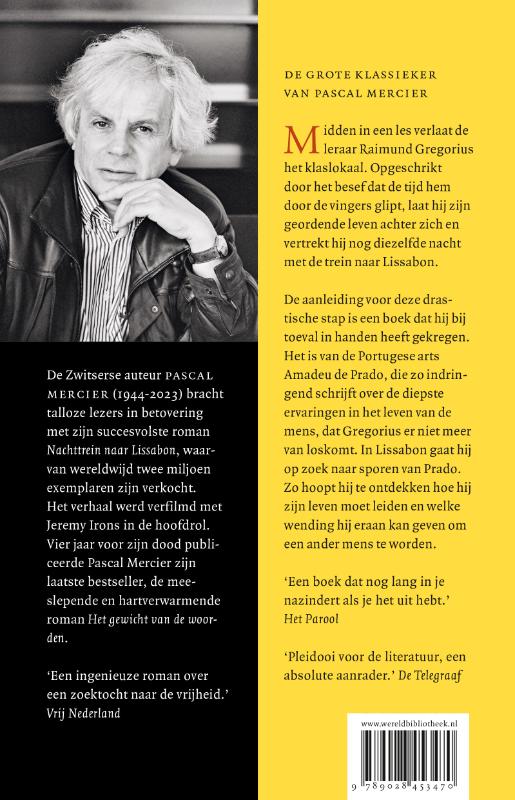 Pascal Merciers grootste bestseller: 300.000 exemplaren verkocht 'Een magistrale roman over alle grote vragen van het bestaan.' de Volkskrant. Midden in een les verlaat de leraar Raimund Gregorius het klaslokaal. Opgeschrikt door het besef dat de tijd hem door de vingers glipt, laat hij zijn geordende leven achter zich en vertrekt hij nog diezelfde nacht met de trein naar Lissabon. De aanleiding voor deze drastische stap is een boek dat hij bij toeval in handen heeft gekregen. Het is van de Portugese arts Amadeu de Prado, die zo indringend schrijft over de diepste ervaringen in het leven van de mens, dat Gregorius er niet meer van loskomt. In Lissabon gaat hij op zoek naar sporen van Prado. Zo hoopt hij te ontdekken hoe hij zijn leven moet leiden en welke wending hij eraan kan geven om een ander mens te worden. 'Een boek dat nog lang in je nazindert als je het uit hebt.' Het Parool 'Pleidooi voor de literatuur, een absolute aanrader.' De Telegraaf