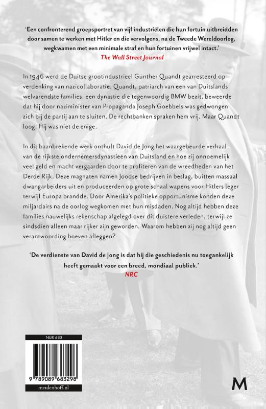Een baanbrekend, meeslepend verhaal over hoe Duitse bedrijven als BMW, Dr. Oetker, Porsche en Volkswagen zich verrijkten tijdens de Tweede Wereldoorlog en er na de oorlog nauwelijks sancties volgden In 1946 werd de Duitse grootindustrieel Günther Quandt gearresteerd op verdenking van nazicollaboratie. Quandt, patriarch van een van Duitslands welvarendste families, een dynastie die tegenwoordig BMW bezit, beweerde dat hij door naziminister van Propaganda Joseph Goebbels was gedwongen zich bij de partij aan te sluiten. De rechtbanken spraken hem vrij. Maar Quandt loog. Hij was niet de enige. In dit baanbrekende werk onthult David de Jong het waargebeurde verhaal van de rijkste ondernemersdynastieën van Duitsland en hoe zij onnoemelijk veel geld en macht vergaarden door te profiteren van de wreedheden van het Derde Rijk. Deze magnaten namen Joodse bedrijven in beslag, buitten massaal dwangarbeiders uit en produceerden op grote schaal wapens voor Hitlers leger terwijl Europa brandde. Door Amerika’s politieke opportunisme konden deze miljardairs na de oorlog wegkomen met hun misdaden. Nog altijd hebben deze families nauwelijks rekenschap afgelegd over dit duistere verleden, terwijl ze sindsdien alleen maar rijker zijn geworden. Waarom hebben zij nog altijd geen verantwoording hoeven afleggen? In de pers ‘Even gedetailleerde als schokkende verhalen. Veel kennis over dit inktzwarte hoofdstuk. Minutieus onderzoek.’ Trouw ‘Een bewonderenswaardig onderzoek.’ De Groene Amsterdammer ‘Zijn verdienste is dat hij die geschiedenis nu toegankelijk heeft gemaakt voor een breed, mondiaal publiek.’ NRC ‘Onthutsend.’ De Limburger ‘Dit briljante debuut dat laat zien hoe een verraderlijke mix van kapitalisme en fascisme de democratie en talloze levens kan vernietigen. Een absolute aanrader.’ Norman Ohler, auteur van Drugs in het Derde Rijk ‘Meeslepend verhaal over smerige oorlogsmisdaden, medeplichtigheid, doofpotaffaires, en ontkenning.’ Patrick Radden Keefe, auteur van Zeg niets en Het pijnstillerimperium ‘Opportunisme en hebzucht. Het kleurrijke verhaal over moordende zakelijke intriges en een melodramatische vete tussen Quandt en Goebbels. Een intieme en levendige geschiedenis.’ Publishers Weekly