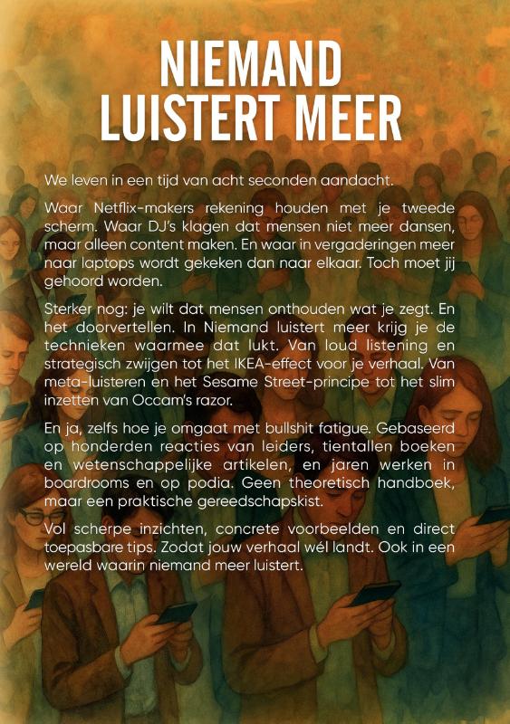 We leven in een tijd van acht seconden aandacht. Waar Netflix-makers rekening houden met je tweede scherm. Waar DJ’s klagen dat mensen niet meer dansen, maar alleen content maken. En waar in vergaderingen meer naar laptops wordt gekeken dan naar elkaar. Toch moet jij gehoord worden. Sterker nog: je wilt dat mensen onthouden wat je zegt. En het doorvertellen. In Niemand luistert meer krijg je de technieken waarmee dat lukt. Van loud listening en strategisch zwijgen tot het IKEA-effect voor je verhaal. Van meta-luisteren en het Sesame Street-principe tot het slim inzetten van Occam’s razor. En ja, zelfs hoe je omgaat met bullshit fatigue. Gebaseerd op honderden reacties van leiders, tientallen boeken en wetenschappelijke artikelen, en jaren werken in boardrooms en op podia. Geen theoretisch handboek, maar een praktische gereedschapskist. Vol scherpe inzichten, concrete voorbeelden en direct toepasbare tips. Zodat jouw verhaal wél landt. Ook in een wereld waarin niemand meer luistert.