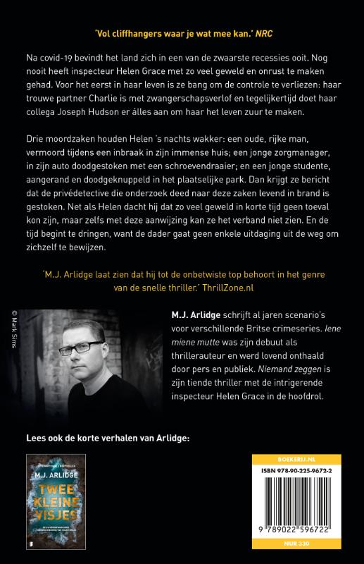 Deel 10 van de Helen Grace -serie Na covid-19 bevindt het land zich in een van de zwaarste recessies ooit. Nog nooit heeft inspecteur Helen Grace met zo veel geweld en onrust te maken gehad. Voor het eerst in haar leven is ze bang om de controle te verliezen: haar trouwe partner Charlie is met zwangerschapsverlof en tegelijkertijd doet haar collega Joseph Hudson er álles aan om haar het leven zuur te maken. Drie moordzaken houden Helen ’s nachts wakker: een oude, rijke man, vermoord tijdens een inbraak in zijn immense huis; een jonge zorgmanager, in haar auto doodgestoken met een schroevendraaier; en een jonge studente, aangerand en doodgeknuppeld in het plaatselijke park. Dan krijgt ze bericht dat de privédetective die onderzoek deed naar deze zaken levend in brand is gestoken. Net als Helen dacht hij dat zo veel geweld in korte tijd geen toeval kon zijn, maar zelfs met deze aanwijzing kan ze het verband niet zien. En de tijd begint te dringen, want de dader gaat geen enkele uitdaging uit de weg om zichzelf te bewijzen. In de pers ‘Sterk visuele hoofdstukken met een hoog adrenalinegehalte.’ Algemeen Dagblad ‘De manier waarop Arlidge ogenschijnlijk moeiteloos eerst verhaaltechnische problemen creëert en ze vervolgens even makkelijk weer oplost, verraadt een lenige, creatieve geest.’ Het Parool ‘Het thrillergeschenk van M.J. Arlidge is geraffineerd en geloofwaardig.’ **** de Volkskrant