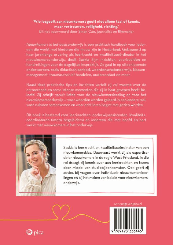 Nieuwkomers in het basisonderwijs is een praktisch handboek voor iedereen die werkt met kinderen die nieuw zijn in Nederland. Gebaseerd op haar jarenlange ervaring als leerkracht en kwaliteitscoördinator in het nieuwkomersonderwijs deelt Saskia Sijm inzichten, voorbeelden en handreikingen voor de dagelijkse lespraktijk. Ze gaat in op uiteenlopende onderwerpen, zoals didactisch aanbod, woordenschatonderwijs, klassenmanagement, traumasensitief handelen, oudercontact en meer. Naast deze praktische tips en inzichten vertelt zij vol warmte over de ontroerende en soms intense momenten die zij in haar groepen heeft beleefd. Zij schrijft vanuit liefde voor de nieuwkomersleerling en voor het nieuwkomersonderwijs — waar woorden worden geleerd in een andere taal, waar culturen samenkomen en waar echt leren begint met gezien worden. Voor leerkrachten, onderwijsassistenten, intern begeleiders en iedereen die met hoofd én hart werkt met nieuwkomers in het onderwijs, zowel in de reguliere groep als in afzonderlijke nieuwkomersgroepen en -scholen.