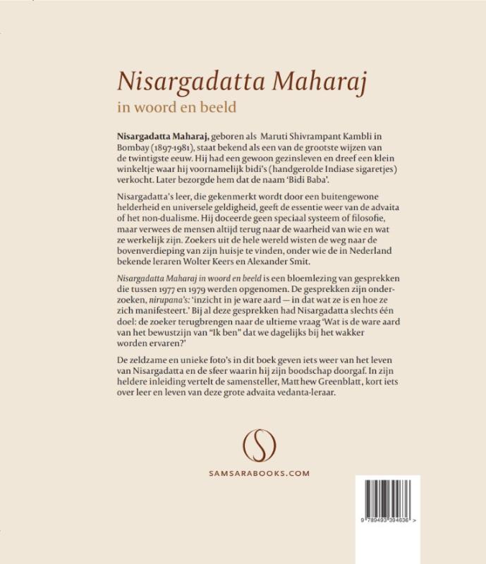 Nisargadata Maharaj, geboren als Maruti Shivrampant Kambli in Bombay (1897-1981), staat bekend als een van de grootste wijzen van de twintigste eeuw. Hij had een gewoon gezinsleven en dreef een klein winkeltje waar hij voornamelijk bidi’s (handgerolde Indiase sigaretjes) verkocht. Later bezorgde hem dat de naam ‘Bidi Baba’. Nisargadata’s leer, die gekenmerkt wordt door een buitengewone helderheid en universele geldigheid, geeft de essentie weer van de advaita of het non-dualisme. Hij doceerde geen speciaal systeem of filosofie, maar verwees de mensen altijd terug naar de waarheid van wie en wat ze werkelijk zijn. Zoekers uit de hele wereld wisten de weg naar de bovenverdieping van zijn huisje te vinden, onder wie de in Nederland bekende leraren Wolter Keers en Alexander Smit. 'Nisargadata Maharaj in woord en beeld' is een bloemlezing van gesprekken die tussen 1977 en 1979 werden opgenomen. De gesprekken zijn onderzoeken, nirupana’s: ‘inzicht in je ware aard — in dat wat ze is en hoe ze zich manifesteert.’ Bij al deze gesprekken had Nisargadata slechts één doel: de zoeker terugbrengen naar de ultieme vraag ‘Wat is de ware aard van het bewustzijn van “Ik ben” dat we dagelijks bij het wakker worden ervaren?’ De zeldzame en unieke foto’s in dit boek geven iets weer van het leven van Nisargadata en de sfeer waarin hij zijn boodschap doorgaf. In zijn heldere inleiding vertelt de samensteller, Mathew Greenblat, kort iets over leer en leven van deze grote advaita vedanta-leraar.