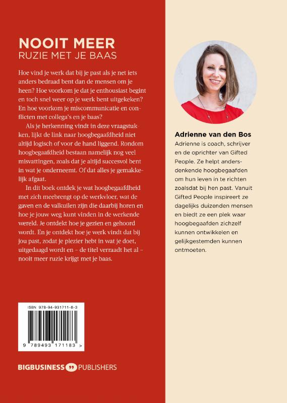 Hoe vind je werk dat bij je past als je net iets anders bedraad bent dan de mensen om je heen? Hoe voorkom je dat je enthousiast begint en toch snel weer op je werk bent uitgekeken? En hoe voorkom je miscommunicatie en conflicten met collega’s en je baas? Als je herkenning vindt in deze vragen, lijkt de link naar hoogbegaafdheid niet altijd logisch of voor de hand liggend. Rondom hoogbegaafdheid bestaan namelijk nog veel misvattingen, zoals dat je altijd succesvol bent in wat je onderneemt. Of dat alles je gemakkelijk afgaat. In dit boek ontdek je wat hoogbegaafdheid met zich meebrengt op de werkvloer, wat de gaven en de valkuilen zijn die daarbij horen en hoe je je weg kunt vinden in de werkende wereld. Je ontdekt hoe je gezien en gehoord wordt. En je ontdekt hoe je werk vindt dat bij je past, zodat je plezier hebt in wat je doet, uitgedaagd wordt en – de titel verraadt het al – nooit meer ruzie krijgt met je baas. Adrienne van den Bos is coach, auteur en de oprichter van Gifted People. Ze helpt andersdenkende hoogbegaafden om hun leven in te richten zoals dat bij hen past. Vanuit Gifted People inspireert ze dagelijks duizenden mensen en biedt ze een plek waar hoogbegaafden zichzelf kunnen ontwikkelen en gelijkgestemden kunnen ontmoeten.