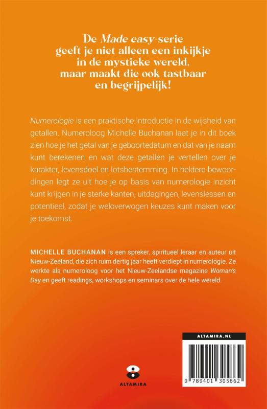 Numerologie' is een praktische introductie in de wijsheid van getallen en het nieuwe deel in de 'Made easy'-serie van Altamira. In dit boek vertelt numeroloog Michelle Buchanan je hoe je het getal van je geboortedatum en dat van je naam kunt berekenen en wat deze getallen je vertellen over je karakter, levensdoel en lotsbestemming. Ontdek de betekenis van jouw getal en krijg zo inzicht in je karaktereigenschappen, je zwakke én sterke kanten en jouw unieke potentieel. Verken welke uitdagingen en kansen er voor jou op de horizon liggen en maak zo weloverwogen keuzes voor de toekomst. Met 'Numerologie' ontdek je welke getallen schuilgaan achter jouw unieke persoonlijkheid en wat deze betekenen voor jou als persoon. Lees ook de andere delen uit de 'Made easy'-serie: 'Contact met engelen', 'Chakra's' en 'De Akashakronieken'.
