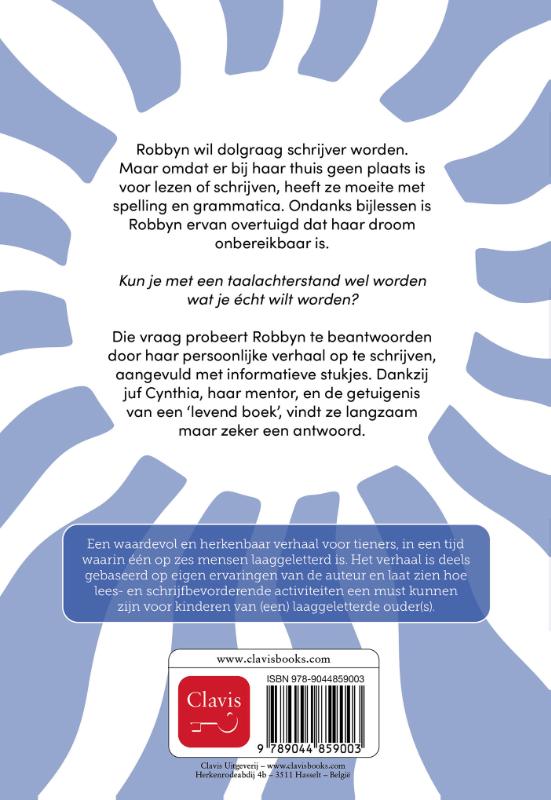 Robbyn wil dolgraag schrijver worden. Maar omdat er bij haar thuis geen plaats is voor lezen of schrijven, heeft ze moeite met spelling en grammatica. Ondanks bijlessen is Robbyn ervan overtuigd dat haar droom onbereikbaar is Kun je met een taalachterstand wel worden wat je écht wilt worden? Die vraag probeert Robbyn te beantwoorden door haar persoonlijke verhaal op te schrijven, aangevuld met informatieve stukjes. Dankzij juf Cynthia, haar mentor, en de getuigenis van een ‘levend boek’, vindt ze langzaam maar zeker een antwoord. Een waardevol en herkenbaar verhaal voor tieners, in een tijd waarin één op zes mensen laaggeletterd is. Het verhaal is deels gebaseerd op eigen ervaringen van de auteur en laat zien hoe lees- en schrijfbevorderende activiteiten een must kunnen zijn voor kinderen van (een) laaggeletterde ouder(s).