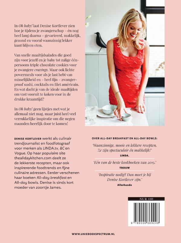 In Oh baby! laat Denise Kortlever zien hoe je tijdens je zwangerschap – én nog heel lang daarna – gevarieerd, makkelijk, gezond en vooral waanzinnig lekker kunt blijven eten. Van snelle maaltijdsalades die goed zijn voor jezelf en je baby tot zalige éénpersoons triple chocolate cookies voor je zwangere cravings . Maar ook lichte powermeals voor als je last hebt van misselijkheid en – heel fijn – zwangerproof sushi, cocktails en filet américain. En wat dacht je van de ideale maaltijden om vast vooruit te koken voor in de drukke kraamtijd? In Oh baby! geen lijstjes met wat je allemaal niet mag, maar juist heel veel verrukkelijke inspiratie om die negen maanden heerlijk door te komen! Denise Kortlever werkt als culinair trendjournalist en foodfotograaf voor merken als LINDA.tv, &C en Vogue . Op haar populaire site thealldaykitchen.com deelt ze de lekkerste recepten, maar ook inspirerende foodtrends en fijne culinaire adressen. Eerder verschenen haar boeken All-day breakfast en All-day bowls . Over All-day breakfast en All-day bowls LINDA. – ‘Waanzinnige, mooie en lekkere recepten. Ze zijn spectaculair én makkelijk!’ TROUW – ‘Eén van de beste kookboeken van 2015.’ Allerhande – ‘Inspiratie nodig? Dan moet je bij Denise Kortlever zijn.’