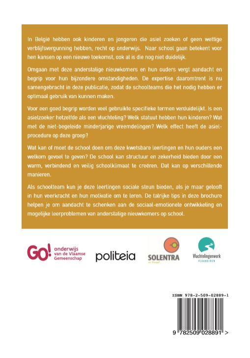 In België hebben ook kinderen en jongeren die asiel zoeken of geen wettige verblijfsvergunning hebben, recht op onderwijs. Naar school gaan betekent voor hen kansen op een nieuwe toekomst, ook al is die nog niet duidelijk. Omgaan met anderstalige nieuwkomers en hun ouders vergt begrip voor hun bijzondere omstandigheden. De expertise over dit onderwerp is nu samengebracht in een brochure. Voor een goed begrip worden veel gebruikte specifieke termen verduidelijkt. Is een asielzoeker hetzelfde als een vluchteling? Welk statuut hebben deze kinderen? Wat met de niet-begeleide minderjarige vreemdelingen? Welk effect heeft de asielprocedure op deze groep? ‘Omgaan met anderstalige nieuwkomers op school’ geeft antwoorden op wat een school kan of moet doen om deze kwetsbare leerlingen en hun ouders een welkom gevoel te geven. Structuur en zekerheid bieden bijvoorbeeld, door een warm, verbindend en veilig schoolklimaat te creëren. Als schoolteam kun je sociale steun bieden, als je maar gelooft in de veerkracht van anderstalige nieuwkomers en hun motivatie om te leren. De talrijke tips in deze brochure helpen je om aandacht te schenken aan hun sociaal-emotionele ontwikkeling en mogelijke leerproblemen. Deze publicatie wordt ondersteund door Vluchtelingenwerk Vlaanderen en Solentra vzw. De boekjes worden verkocht in pakketten per 5 stuks. Vermelde prijs is per pakket. Deze publicatie past in een reeks waarmee het GO! directeurs, leerkrachten, ouders en andere betrokkenen een helpende hand wil reiken. Op een overzichtelijke en bondige manier wordt weergegeven welk beleid een school zou kunnen of moeten voeren of opzetten rond een ‘zorgwekkend’ thema.
