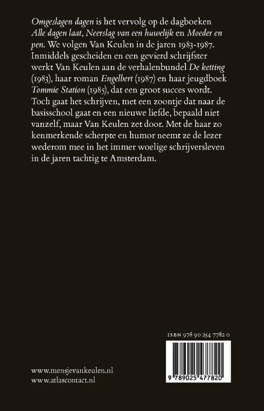 Omgeslagen dagen is het vervolg op de dagboeken Alle dagen laat, Neerslag van een huwelijk en Moeder en pen. We volgen Van Keulen in de jaren 1983-1987. Inmiddels gescheiden en een gevierd schrijfster werkt Van Keulen aan de verhalenbundel De ketting (1983), haar roman Engelbert (1987) en haar jeugdboek Tommie Station (1985), dat een groot succes wordt. Toch gaat het schrijven, met een zoontje dat naar de basisschool gaat en een nieuwe liefde, bepaald niet vanzelf, maar Van Keulen zet door. Met de haar zo kenmerkende scherpte en humor neemt ze de lezer wederom mee in het immer woelige schrijversleven in de jaren tachtig te Amsterdam.