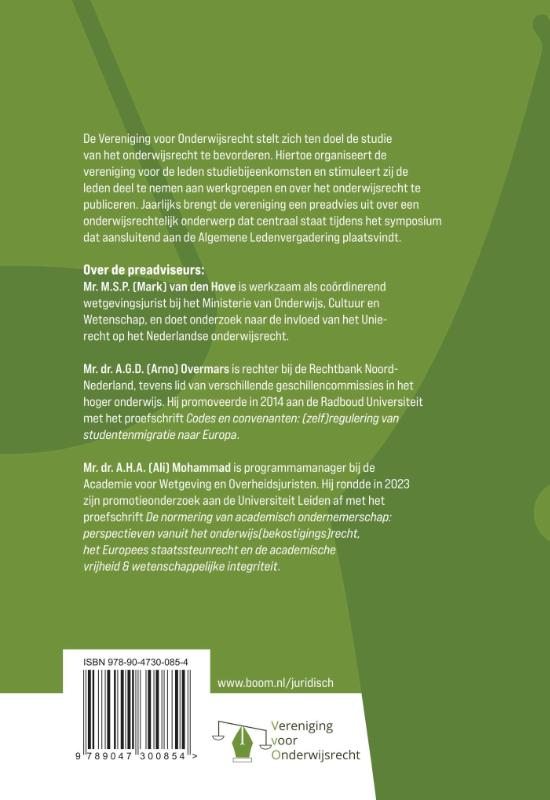 De Vereniging voor Onderwijsrecht stelt zich ten doel de studie van het onderwijsrecht te bevorderen. Hiertoe organiseert de vereniging voor de leden studiebijeenkomsten en stimuleert zij de leden deel te nemen aan werkgroepen en over het onderwijsrecht te publiceren. Jaarlijks brengt de vereniging een preadvies uit over een onderwijsrechtelijk onderwerp dat centraal staat tijdens het symposium dat aansluitend aan de Algemene Ledenvergadering plaatsvindt. Over de preadviseurs: Mr. M.S.P. (Mark) van den Hove is werkzaam als coördinerend wetgevingsjurist bij het Ministerie van Onderwijs, Cultuur en Wetenschap, en doet onderzoek naar de invloed van het Unierecht op het Nederlandse onderwijsrecht. Mr. dr. A.G.D. (Arno) Overmars is rechter bij de Rechtbank NoordNederland, tevens lid van verschillende geschillencommissies in het hoger onderwijs. Hij promoveerde in 2014 aan de Radboud Universiteit met het proefschrift Codes en convenanten: (zelf)regulering van studentenmigratie naar Europa. Mr. dr. A.H.A. (Ali) Mohammad is programmamanager bij de Academie voor Wetgeving en Overheidsjuristen. Hij rondde in; zijn promotieonderzoek aan de Universiteit Leiden af met het proefschrift De normering van academisch ondernemerschap: perspectieven vanuit het onderwijs(bekostigings)recht, het Europees staatssteunrecht en de academische vrijheid & wetenschappelijke integriteit