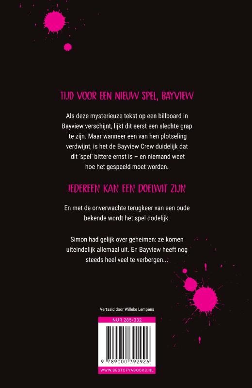 TIJD VOOR EEN NIEUW SPEL, BAYVIEW Als deze mysterieuze tekst op een billboard in Bayview verschijnt, lijkt dit eerst een slechte grap te zijn. Maar wanneer een van hen plotseling verdwijnt, is het de Bayview Crew duidelijk dat dit ‘spel’ bittere ernst is – en niemand weet hoe het gespeeld moet worden. ER IS MAAR ÉÉN REGEL Iedereen kan een doelwit zijn. En met de onverwachte terugkeer van een oude bekende begint het spel dodelijk te worden. Simon had gelijk over geheimen: ze komen uiteindelijk allemaal uit. En Bayview heeft nog steeds heel veel te verbergen… Deel 1 van deze spannende Young Adult-trilogie voor jongeren vanaf 15 jaar is als serie te zien op Netflix. Lees verder in deze serie: One of us is lying (deel 1) One of us is next (deel 2) Lees ook van Karen M. McManus: Twee kunnen een geheim bewaren Familie liegt nooit Jij wordt nog eens mijn dood Niets meer te zeggen