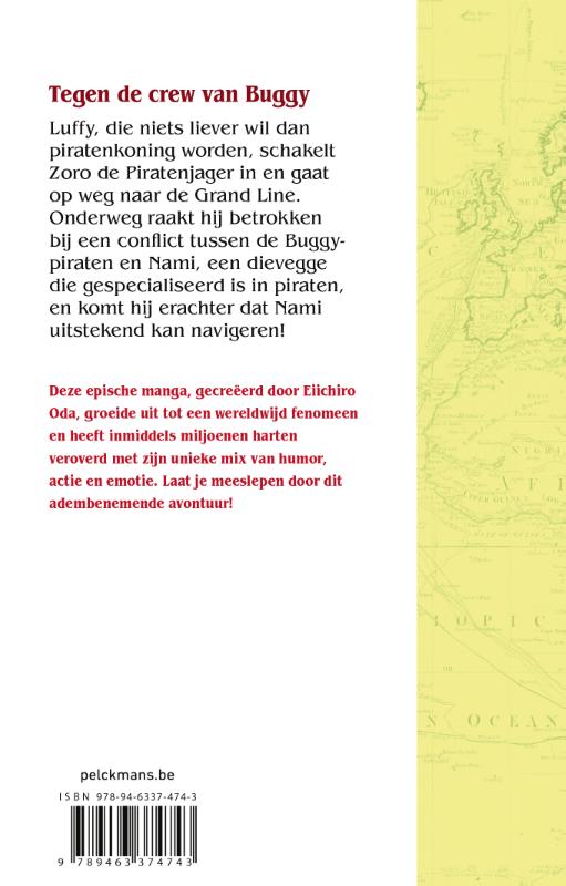 Luffy, die niets liever wil dan piratenkoning worden, schakelt Zoro de Piratenjager in en gaat op weg naar de Grand Line. Onderweg raakt hij betrokken bij een conflict tussen de Buggy-piraten en Nami, een dief die gespecialiseerd is in piraten, en komt hij erachter dat Nami uitstekend kan navigeren! Eiichiro Oda, geboren op 1 januari 1975 in Kumamoto (Japan), is mangaka en auteur van One Piece. Deze serie wordt vanaf 1997 tot op de dag van vandaag uitgebracht in het tijdschrift Weekly Shōnen Jump. One Piece bestaat uit meer dan 1000 hoofdstukken en 100 volumes, en met 500 miljoen exemplaren in omloop (2022) breekt de serie alle wereldrecords. Het is een mangaserie die niet alleen in Japan, maar over de hele wereld mateloos populair is. In 1992, toen Oda 17 was, heeft hij bij de Tezuka Awards de tweede plaats behaald voor zijn eerste one-shot Wanted. Tijdens zijn werk als assistent schreef hij Romance Dawn, een voorloper van het huidige One Piece.