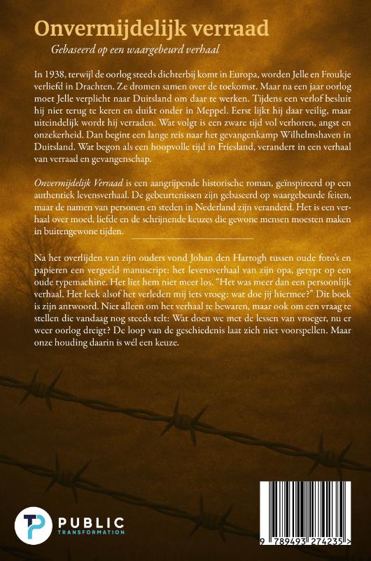 In 1938, terwijl de oorlog steeds dichterbij komt in Europa, worden Jelle en Froukje verliefd in Drachten. Ze dromen samen over de toekomst. Maar na een jaar oorlog moet Jelle verplicht naar Duitsland om daar te werken. Tijdens een verlof besluit hij niet terug te keren en duikt onder in Meppel. Eerst lijkt hij daar veilig, maar uiteindelijk wordt hij verraden. Wat volgt is een zware tijd vol verhoren, angst en onzekerheid. Dan begint een lange reis naar het gevangenkamp Wilhelmshaven in Duitsland. Wat begon als een hoopvolle tijd in Friesland, verandert in een verhaal van verraad en gevangenschap. Onvermijdelijk Verraad is een aangrijpende oorlogsroman, geïnspireerd op een authentiek levensverhaal. De gebeurtenissen zijn gebaseerd op waargebeurde feiten, maar de namen van personen en steden in Nederland zijn veranderd. Het is een verhaal over moed, liefde en de schrijnende keuzes die gewone mensen moesten maken in buitengewone tijden.
