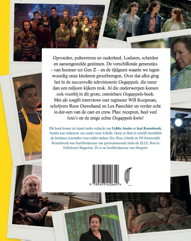 Voor alle fans die geen genoeg kunnen krijgen van de kinderen, ouders en grootouders is er nu het grote Oogappels-boek. Over opvoeden, puberstress en ouderleed. Het gaat over loslaten en scheiden, over de verschillende generaties - van boomer tot Gen Z -, over samengestelde gezinnen en over de tijdgeest waarin we tegenwoordig onze kinderen grootbrengen. In de succesvolle televisieserie, die meer dan een miljoen kijkers trok, kwam het allemaal aan de orde. Net als in dit boek. Met als toegift interviews met regisseur Will Koopman, schrijvers Roos Ouwehand en Lex Passchier en verder echt ie-de-reen van de cast en crew. En meer: • wijze lessen van de grootouders • duiding over de sociologische betekenis van deze serie • heel veel foto’s • tips en verhalen over opvoeden en loslaten • de grote Oogappels-quiz • iconische Merel-monologen • recepten uit de serie • uitleg over de verschillende generaties: van babyboomer tot gen Z • interviews met de bedenker en de regisseur van de serie, Will Koopman, met alle hoofdrolspelers en heel veel leden van de crew en natuurlijk met de schrijvers, Roos Ouwehand en Lex Passchier Scenario tv-serie Oogappels: Roos Ouwehand en Lex Passchier Regie tv-serie Oogappels: Will Koopman