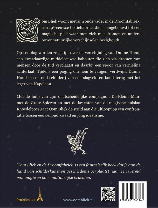 Oom Bliek woont met zijn oude vader in de Droomfabriek, een 19e-eeuwse textielfabriek die is omgebouwd tot een magische plek waar men zich met dromen en andere bovennatuurlijke verschijnselen bezighoudt. Op een dag worden ze getipt over de verschijning van Dunne Hond, een kwaadaardige middeleeuwse kabouter die zich via dromen van mensen door de tijd verplaatst en daarbij een spoor van vernieling achterlaat. Tijdens een poging om hem te vangen, verdwijnt Dunne Hond in een oud schilderij van een slagveld en komt terug met het leger van Napoleon. Met de hulp van zijn onafscheidelijke compagnon De-Kleine-Man-met-de-Grote-Spieren en met de krachten van de magische huiskat Knoedelpoes, gaat Oom Bliek de strijd aan die uitloopt op een confrontatie tussen eeuwenoud kwaad en jong idealisme. Oom Bliek en de Droomfabriek is een fantastierijk boek dat je aan de hand van schilderkunst en geschiedenis verplaatst naar een wereld van magie en bovennatuurlijke krachten.