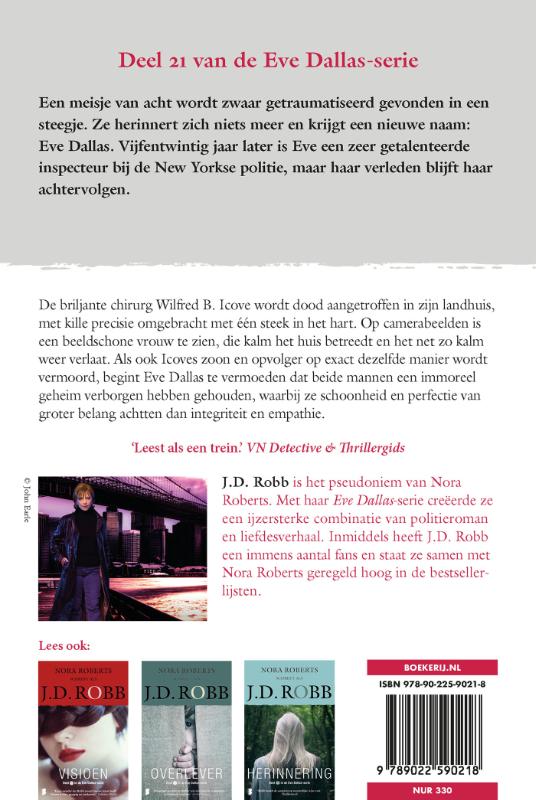 Deel 21 van de Eve Dallas -serie ‘Hard en waanzinnig sexy.’ Stephen King De briljante chirurg Wilfred B. Icove wordt dood aangetroffen in zijn landhuis, met kille precisie omgebracht met één steek in het hart. Op camerabeelden is een beeldschone vrouw te zien, die kalm het huis betreedt en het net zo kalm weer verlaat. Als ook Icoves zoon en opvolger op exact dezelfde manier wordt vermoord, begint Eve Dallas te vermoeden dat beide mannen een immoreel geheim verborgen hebben gehouden, waarbij ze schoonheid en perfectie van groter belang achtten dan integriteit en empathie. In de pers ‘Leest als een trein.’ VN Detective en Thrillergids ‘J.D. Robb (a.k.a. Nora Roberts) heeft een bijzonder vlotte pen.’ VN Detective & Thrillergids ‘Voor de lezer die enkele uurtjes ontspanning zoekt en meegesleept wil worden in een spannend maar ook romantisch verhaal, is dit zeker een aanrader.’ Hebban.nl ‘Heeft alle ingrediënten die garant staan voor uren leesplezier.’ ThrillZone.nl