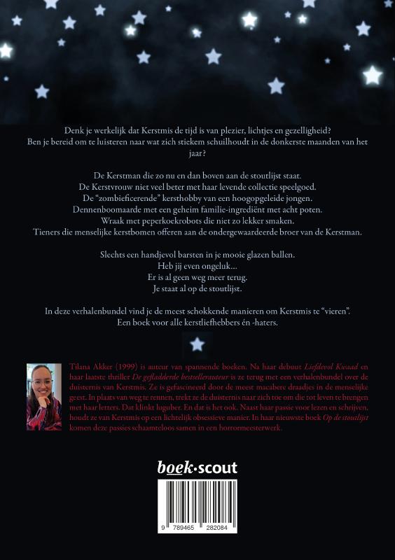 Denk je werkelijk dat Kerstmis de tijd is van plezier, lichtjes en gezelligheid? Ben je bereid om te luisteren naar wat zich stiekem schuilhoudt in de donkerste maanden van het jaar? De Kerstman die zo nu en dan boven aan de stoutlijst staat. De Kerstvrouw niet veel beter met haar levende collectie speelgoed. De “zombieficerende” kersthobby van een hoogopgeleide jongen. Dennenboomaarde met een geheim familie-ingrediënt met acht poten. Wraak met peperkoekrobots die niet zo lekker smaken. Tieners die menselijke kerstbomen offeren aan de ondergewaardeerde broer van de Kerstman. Slechts een handjevol barsten in je mooie glazen ballen. Heb jij even ongeluk… Er is al geen weg meer terug. Je staat al op de stoutlijst. In deze verhalenbundel vind je de meest schokkende manieren om Kerstmis te “vieren”. Een boek voor alle kerstliefhebbers én -haters.