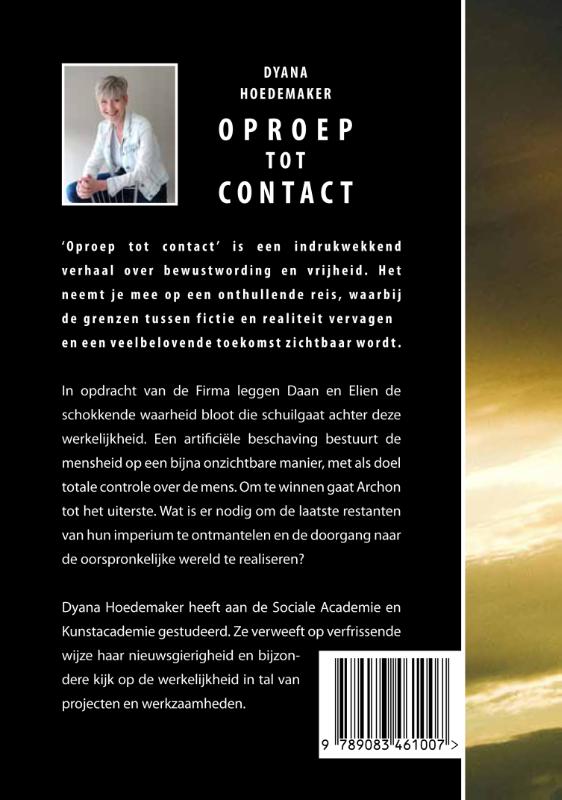 ‘Oproep tot contact’ is een indrukwekkend verhaal over bewustwording en vrijheid. Het neemt je mee op een onthullende reis, waarbij de grenzen tussen fictie en realiteit vervagen en een veelbelovende toekomst zichtbaar wordt. In opdracht van de Firma leggen Daan en Elien de schokkende waarheid bloot die schuilgaat achter deze werkelijkheid. Een artificiële beschaving bestuurt de mensheid op een bijna onzichtbare manier, met als doel totale controle over de mens. Om te winnen gaat Archon tot het uiterste. Wat is er nodig om de laatste restanten van hun imperium te ontmantelen en de doorgang naar de oorspronkelijke wereld te realiseren? Dyana Hoedemaker heeft aan de Sociale Academie en Kunstacademie gestudeerd. Ze verweeft op verfrissende wijze haar nieuwsgierigheid en bijzondere kijk op de werkelijkheid in tal van projecten en werkzaamheden. Haar drijfveer is het realiseren van positieve veranderingen en het stimuleren van bewustzijn.