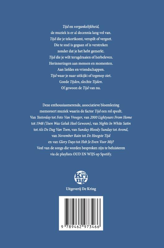 Tijd als thema in honderden pop- en rocksongs ***** Tijd en vergankelijkheid, de muziek is er al decennialang vol van. Tijd die je tekortkomt, verspilt of vergeet. Die te snel is gegaan of is verstreken zonder dat je het hebt gemerkt. Tijd die je wilt terugdraaien of herbeleven. Herinneringen aan mensen en momenten. Aan liefdes en vriendschappen. Tijd waar je naar uitkijkt of tegenop ziet. Goede tijden, slechte tijden. Deze enthousiasmerende, associatieve bloemlezing memoreert muziek waarin de factor Tijd een rol speelt. Van YESTERDAY tot FOTO VAN VROEGER, van NIGHTS IN WHITE SATIN tot ALS DE DAG VAN TOEN en van GLORY DAYS tot HEB JE EVEN VOOR MIJ? Veel van de songs die in dit boek besproken worden, zijn te beluisteren via de playlists "De Kring OUD EN WIJS" op Spotify. Een absolute aanrader voor álle muziekliefhebbers!