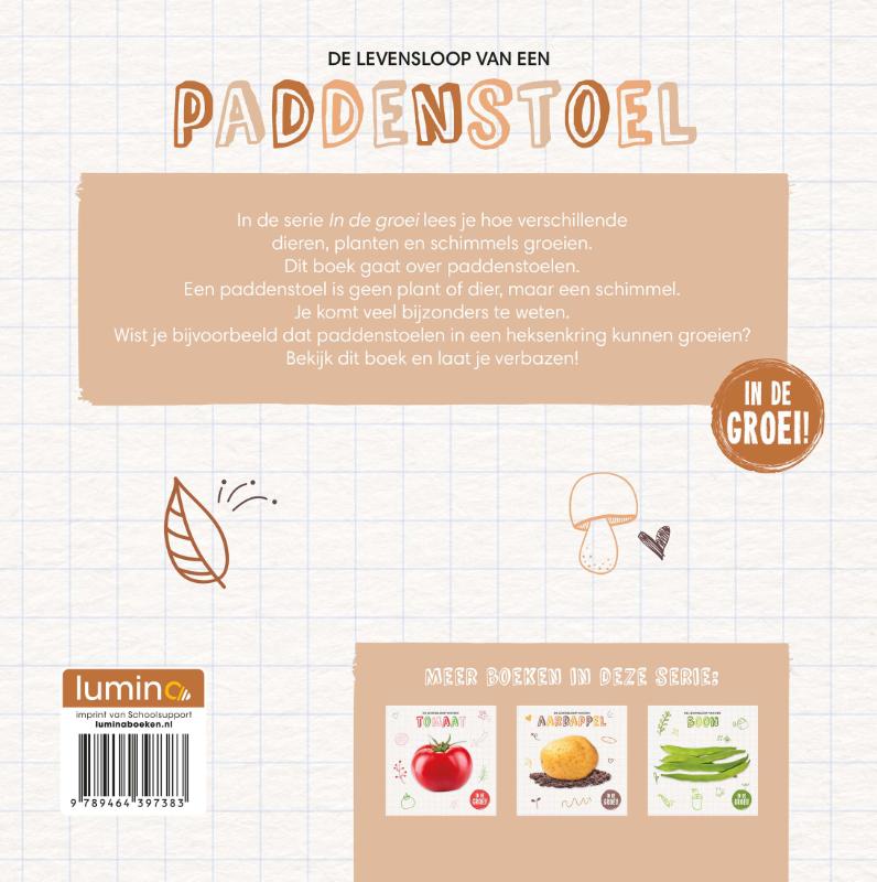 In de serie In de groei lees je hoe verschillende dieren, planten en schimmels groeien. Dit boek gaat over paddenstoelen. Een paddenstoel is geen plant of dier, maar een schimmel. Je komt veel bijzonders te weten. Wist je bijvoorbeeld dat paddenstoelen in een heksenkring kunnen groeien? Bekijk dit boek en laat je verbazen!