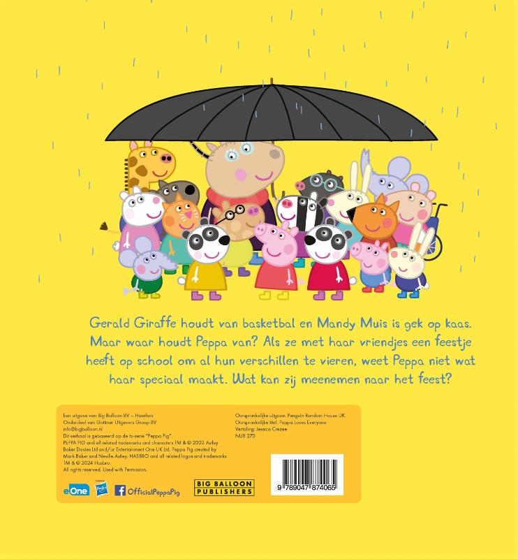 Betover je kleintjes met de hartverwarmende verhalen van Peppa Pig. In het nieuwe voorleesboek 'Peppa houdt van iedereen' beleven Peppa en haar vrienden avonturen boordevol vrolijkheid, vriendschap en leren ze natuurlijk ook belangrijke levenslessen. Mandy Muis houdt van kaas, Kelly Konijn houdt van wortels en Gerard Giraf is dol op basketbal. Maar als alle vriendjes op de peuterspeelzaal vertellen waar ze van houden en samen vieren dat ze allemaal anders zijn, weet Peppa niet zo goed wat ze moet kiezen... Peppa Pig is het schattige en ondeugende biggetje uit de gelijknamige wereldberoemde en razend populaire animatieserie. Ze woont samen met haar kleine broertje George, Mama Big en Papa Big en houdt van spelletjes spelen, verkleden, dagjes uit en in modderpoelen springen! Peppa's avonturen eindigen altijd goed en met een vrolijke knor.