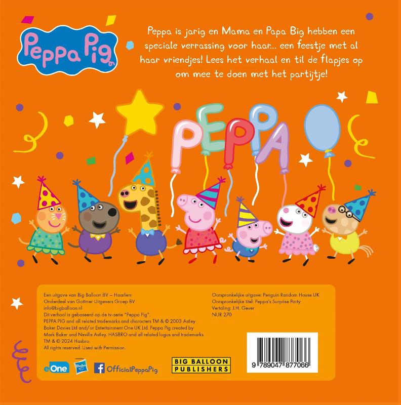 Het is feest, want ‘Peppa Pig’ is jarig in ‘Peppa’s verrassingsfeestje’! Dit interactieve prentenboek met flapjes barst van de vrolijkheid en maakt voorlezen nóg leuker. Mama en Papa Big hebben een speciale verrassing voor Peppa in petto: een feestje met ál haar vriendjes. Peppa staat in het middelpunt van belangstelling en jij kunt samen met haar alle verjaardagsverrassingen ontdekken. ‘Peppa Pig’ is het schattige en ondeugende biggetje uit de gelijknamige wereldberoemde en razend populaire animatieserie. Ze woont samen met haar kleine broertje George, Mama Big en Papa Big en houdt van spelletjes spelen, verkleden, dagjes uit en in modderpoelen springen! Peppa’s avonturen eindigen altijd goed en met een vrolijke knor.