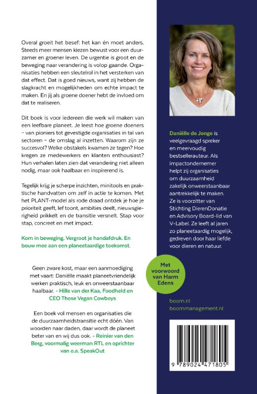Overal groeit het besef: het kan én moet anders. Steeds meer mensen kiezen bewust voor een duurzamer en groener leven. De urgentie is groot en de beweging naar verandering is volop gaande. Organisaties hebben een sleutelrol in het versterken van dat effect. Dat is goed nieuws, want zij hebben de slagkracht en mogelijkheden om echte impact te maken. En jij als groene doener hebt de invloed om dat te realiseren. Dit boek is voor iedereen die werk wil maken van een leefbare planeet. Je leest hoe groene doeners – van pioniers tot gevestigde organisaties in tal van sectoren – de omslag al inzetten. Waarom zijn ze succesvol? Welke obstakels kwamen ze tegen? Hoe kregen ze medewerkers en klanten enthousiast? Hun verhalen laten zien dat verandering niet alleen nodig, maar ook haalbaar en inspirerend is. Tegelijk krijg je scherpe inzichten, minitools en praktische handvatten om zelf in actie te komen. Met het PLANT-model als rode draad ontdek je hoe je prioriteit geeft, lef toont, ambities deelt, nieuwsgierigheid prikkelt en de transitie versnelt. Stap voor stap, concreet en met impact. Kom in beweging. Vergroot je handafdruk. En bouw mee aan een planeetaardige toekomst. ‘Wil jij op je werk eindelijk écht planeetvriendelijker handelen, maar weet je niet waar te beginnen? Dit boek geeft je precies die schop onder je kont die je nodig hebt. Met haar frisse blik en onweerstaanbare enthousiasme laat Daniëlle je zien hoe makkelijk en leuk het is om het verschil te maken.’ – Hille van der Kaa, Foodheld en CEO Those Vegan Cowboys ‘Goed voorbeeld doet volgen. Een bekende oneliner die wel heel goed van toepassing is op dit inspirerende boek van Daniëlle. Het staat vol met mensen en organisaties die niet alleen praten over duurzaamheid, maar de transitie ook echt uitvoeren. Als koploper, starter of groot bedrijf. Van woorden naar daden. Daar wordt de planeet beter van. En wij dus ook.’ – Reinier van den Berg, voormalig weerman en oprichter van o.a. SpeakOut Daniëlle de Jonge is veelgevraagd spreker en meervoudig bestsellerauteur. Als impactondernemer helpt zij organisaties om duurzaamheid zakelijk onweerstaanbaar aantrekkelijk te maken. Ze is voorzitter van Stichting DierenDonatie en Advisory Board-lid van V-Label. Ze leeft al jaren zo planeetaardig mogelijk, gedreven door haar liefde voor dieren en natuur.