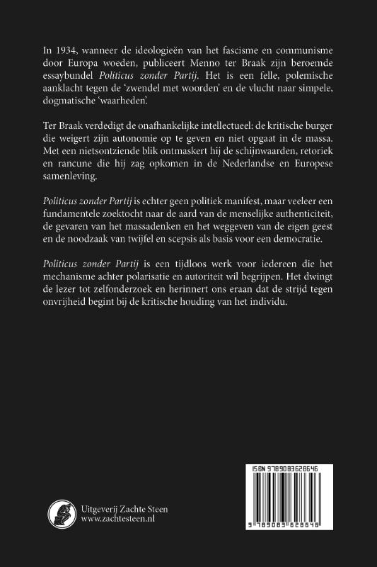 In 1934, wanneer de ideologieën van het fascisme en communisme door Europa woeden, publiceert Menno ter Braak zijn beroemde essaybundel Politicus zonder Partij. Het is een felle, polemische aanklacht tegen de 'zwendel met woorden' en de vlucht naar simpele, dogmatische ‘waarheden’. Ter Braak verdedigt de onafhankelijke intellectueel: de kritische burger die weigert zijn autonomie op te geven en niet opgaat in de massa. Met een nietsontziende blik ontmaskert hij de schijnwaarden, retoriek en rancune die hij zag opkomen in de Nederlandse en Europese samenleving. Politicus zonder Partij is echter geen politiek manifest, maar veeleer een fundamentele zoektocht naar de aard van de menselijke authenticiteit, de gevaren van het massadenken en het weggeven van de eigen geest en de noodzaak van twijfel en scepsis als basis voor een democratie. Politicus zonder partij is een tijdloos werk voor iedereen die het mechanisme achter polarisatie en autoriteit wil begrijpen. Het dwingt de lezer tot zelfonderzoek en herinnert ons eraan dat de strijd tegen onvrijheid begint bij de kritische houding van het individu.