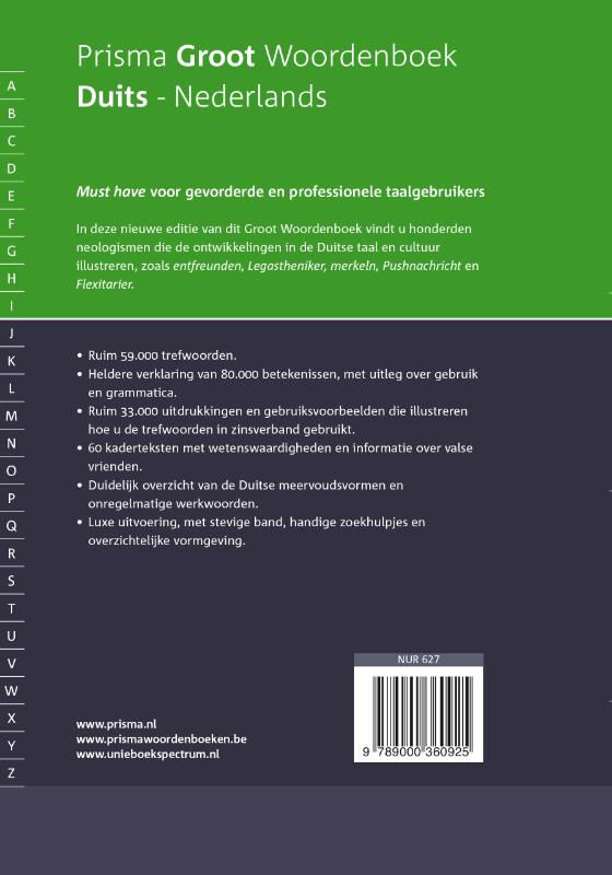 Het vlaggenschip van Prisma, de vermaarde reeks Handwoordenboeken, is vernieuwd. Nu in losse delen, met een chique integraalband en met een nieuwe, frisse naam die de inhoud eer aandoet: Prisma Groot Woordenboek . De Grote Woordenboeken zijn geredigeerd door native speakers in nauwe samenwerking met de Prisma redactie. Musthaves wanneer je voor je beroep of studie veel met taal bezig bent, in de bovenbouw van het vwo en op kantoor. • Luxe uitvoering met een uitstekende prijs-kwaliteitverhouding • Geactualiseerd, met speciale aandacht voor zakelijk en juridisch jargon • Eigentijdse, gebruiksvriendelijke vormgeving • Handige kaderteksten met tips en taalweetjes • Duits-Nederlands: ruim 50.000 trefwoorden, 66.000 betekenissen en circa 40.000 gebruiksvoorbeelden