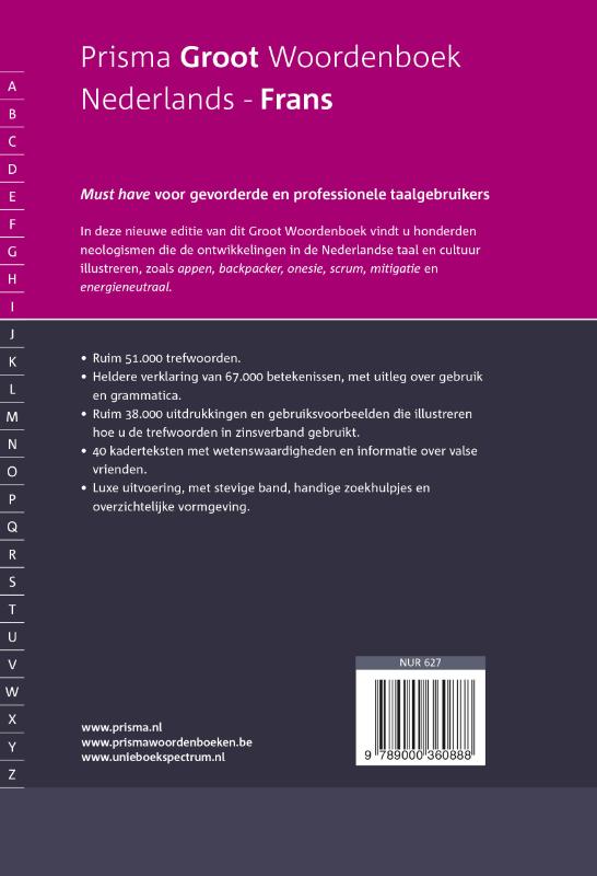 Het vlaggenschip van Prisma, de vermaarde reeks Handwoordenboeken, is vernieuwd. Nu in losse delen, met een chique integraalband en met een nieuwe, frisse naam die de inhoud eer aandoet: Prisma Groot Woordenboek . De Grote Woordenboeken zijn geredigeerd door native speakers in nauwe samenwerking met de Prisma redactie. Musthaves wanneer je voor je beroep of studie veel met taal bezig bent, in de bovenbouw van het vwo en op kantoor. • Luxe uitvoering met een uitstekende prijs-kwaliteitverhouding • Geactualiseerd, met speciale aandacht voor zakelijk en juridisch jargon • Eigentijdse, gebruiksvriendelijke vormgeving • Handige kaderteksten met tips en taalweetjes • Nederlands-Frans: ruim 52.000 trefwoorden, 67.000 betekenissen en circa 38.000 gebruiksvoorbeelden