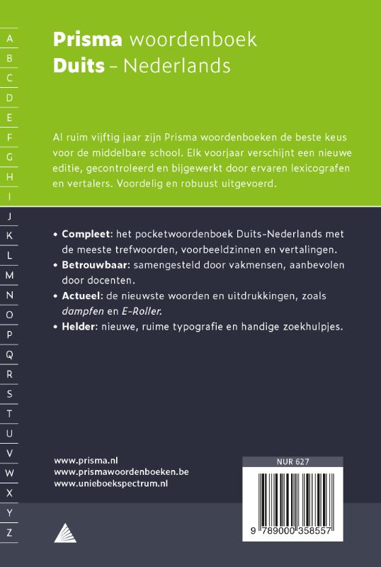 De beste keuze voor schooljaar 2025/2026 Prisma woordenboeken worden het meest aangeraden door docenten, voor scholieren van brugklas tot eindexamen. Voldoen aan alle exameneisen 2025-2026, voor vmbo, havo en vwo in Nederland en het secundair onderwijs in België. Waarom Prisma de slimste keuze is Al ruim 60 jaar stellen ervaren lexicografen de Prisma woordenboeken samen. Ook deze 2024 editie Duits-Nederlands uit is volledig bijgewerkt met 37.000+ trefwoorden en de nieuwste woorden , waardoor ze betrouwbaar, compleet en actueel zijn. Daarnaast onderscheiden Prisma woordenboeken zich door de slimme navigatie , met letterliniaal en duimgrepen. Zo zijn woorden veel sneller te vinden – ideaal tijdens toetsen en examens. Ook deze editie Duits-Nederlands is volledig bijgewerkt: Duidelijke betekenissen en vertalingen met praktische en actuele voorbeeldzinnen Spreekwoorden en uitdrukkingen die regelmatig in toetsen en dagelijks leven voorkomen Uitspraak en grammatica inclusief vervoegingen en lidwoorden Letterliniaal, blauwe kopregels en duimgrepen - vind je woord in 5 seconden