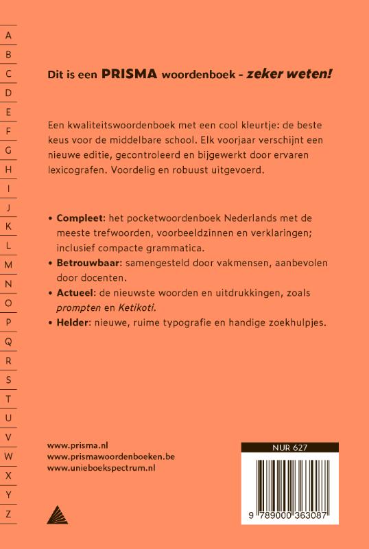 De beste keuze voor schooljaar 2025/2026: een kwaliteitswoordenboek met een cool FLUO kleurtje. Prisma woordenboeken worden het meest aangeraden door docenten, voor scholieren van brugklas tot eindexamen. Voldoen aan alle exameneisen 2025-2026, voor vmbo, havo en vwo in Nederland en het secundair onderwijs in België. Waarom Prisma de slimste keuze is Al ruim 60 jaar stellen ervaren lexicografen de Prisma woordenboeken samen. Ook deze 2024 editie Nederlands verklarend is volledig bijgewerkt met 36.000+ trefwoorden en de nieuwste woorden , waardoor ze betrouwbaar, compleet en actueel zijn. Daarnaast onderscheiden Prisma-woordenboeken zich door de slimme navigatie , met letterliniaal en duimgrepen. Zo zijn woorden veel sneller te vinden – ideaal tijdens toetsen en examens. Ook deze editie Nederlands verklarend is volledig bijgewerkt: Duidelijke definities met praktische en actuele voorbeeldzinnen Spreekwoorden en uitdrukkingen die regelmatig in toetsen en dagelijks leven voorkomen Uitspraak en grammatica inclusief vervoegingen en lidwoorden Compacte Nederlandse grammatica achterin als extra ondersteuning Letterliniaal, blauwe kopregels en duimgrepen - vind je woord in 5 seconden