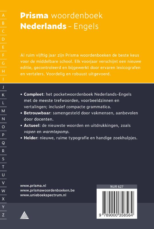 De beste keuze voor schooljaar 2025/2026 Prisma woordenboeken worden het meest aangeraden door docenten, voor scholieren van brugklas tot eindexamen. Voldoen aan alle exameneisen 2025-2026, voor vmbo, havo en vwo in Nederland en het secundair onderwijs in België. Waarom Prisma de slimste keuze is Al ruim 60 jaar stellen ervaren lexicografen de Prisma woordenboeken samen. Ook deze 2024 editie Nederlands-Engels is volledig bijgewerkt met 31.000+ trefwoorden en de nieuwste woorden , waardoor ze betrouwbaar, compleet en actueel zijn. Daarnaast onderscheiden Prisma woordenboeken zich door de slimme navigatie , met letterliniaal en duimgrepen. Zo zijn woorden veel sneller te vinden – ideaal tijdens toetsen en examens. Ook deze editie Nederlands-Engels is volledig bijgewerkt: Duidelijke betekenissen en vertalingen met praktische en actuele voorbeeldzinnen Spreekwoorden en uitdrukkingen die regelmatig in toetsen en dagelijks leven voorkomen Uitspraak en grammatica inclusief vervoegingen en lidwoorden Compacte Engelse grammatica achterin als extra ondersteuning Letterliniaal, blauwe kopregels en duimgrepen - vind je woord in 5 seconden