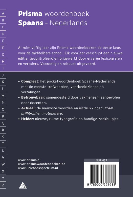De beste keuze voor schooljaar 2025/2026 Prisma woordenboeken worden het meest aangeraden door docenten, voor scholieren van brugklas tot eindexamen. Voldoen aan alle exameneisen 2025-2026, voor vmbo, havo en vwo in Nederland en het secundair onderwijs in België.   Waarom Prisma de slimste keuze is Al ruim 60 jaar stellen ervaren lexicografen de Prisma woordenboeken samen. Ook deze 2024 editie Spaans-Nederlands is volledig bijgewerkt met 33.000+ trefwoorden en de nieuwste woorden , waardoor ze betrouwbaar, compleet en actueel zijn. Daarnaast onderscheiden Prisma woordenboeken zich door de slimme navigatie , met letterliniaal en duimgrepen. Zo zijn woorden veel sneller te vinden – ideaal tijdens toetsen en examens. Ook deze editie Spaans-Nederlands is volledig bijgewerkt: Duidelijke betekenissen en vertalingen met praktische en actuele voorbeeldzinnen Spreekwoorden en uitdrukkingen die regelmatig in toetsen en dagelijks leven voorkomen Uitspraak en grammatica inclusief vervoegingen en lidwoorden Letterliniaal, blauwe kopregels en duimgrepen - vind je woord in 5 seconden