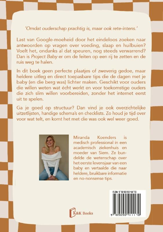 ‘Omdat ouderschap prachtig is, maar ook rete-intens.’ Last van Google-moeheid door het eindeloos zoeken naar antwoorden op vragen over voeding, slaap en huilbuien? Voelt het, ondanks al dat speuren, nog steeds verwarrend? Dan is Project Baby er om de feiten op een rij te zetten en de ruis weg te halen. In dit boek geen perfecte plaatjes of zweverig gedoe, maar heldere uitleg en direct toepasbare tips die de dagen met je baby (en die berg was) lichter maken. Geschikt voor ouders die willen weten wat écht werkt en voor toekomstige ouders die zich slim willen voorbereiden, zonder het internet eerst uit te spelen. Ga je goed op structuur? Dan vind je ook overzichtelijke uitzetlijsten, handige schema’s en checklists. Zo houd je tijd over voor wat telt, en komt het met die was ook wel weer goed. Miranda Koenders is medisch professional in een academisch ziekenhuis en moeder van Siem. Ze bundelde de wetenschap over het eerste levensjaar van een baby en vertaalde die naar heldere, bruikbare informatie en no-nonsense tips.