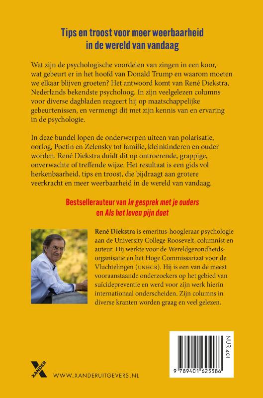 In de bundel Psychologie voor elke dag lopen de onderwerpen uiteen van polarisatie, oorlog, Trump en Zelensky tot familie, kleinkinderen en ouder worden. Wat zijn de psychologische voordelen van zingen in een koor, wat gebeurt er in het hoofd van Donald Trump en waarom moeten we elkaar blijven groeten? Het antwoord komt van René Diekstra, Nederlands bekendste psycholoog. In zijn veelgelezen columns voor diverse dagbladen reageert hij op maatschappelijke gebeurtenissen, en vermengt dit met zijn kennis van en ervaring in de psychologie. René Diekstra duidt dit op ontroerende, grappige, onverwachte of treffende wijze. Het resultaat is een gids vol herkenbaarheid, tips en troost, die bijdraagt aan meer veerkracht en weerbaarheid in de wereld van vandaag. Psychologie voor elke dag is een bundel van meer dan 100 columns over menselijkheid, verbinding en veerkracht in verwarrende tijden. Geschreven door bestsellerauteur van o.a. In gesprek met je ouders en Als leven pijn doet.